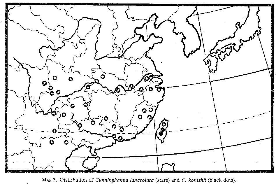 Распространение куннингамии. В Китае этот вид широко культивируется. В местах культивирования, бывает, натурализуется. Поэтому трудно сказать, насколько показанный на карте ареал является природным. Как видите, это две таксономических отдельности. Одна относительно широко распространена в субтропическом и тропическом Китае, другая является эндемиком Тайваня. Отличаются они некоторыми ботаническими тонкостями, а также устойчивостью к морозу. Китайский вид устойчив от 7-й, тайваньский – от 9-й зоны USDA (ссылка на источник рисунка)