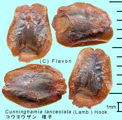 Семена куннингамии. Размер вы видите. Семена снабжены кожистым крылом, которое хотя и не особенно развито, все-таки помогает в распространении семян ветром. Крыло, как и у всех кипарисовых, происходит от семенной кожуры. Это принципиально отличает кипарисовые от сосновых, у которых такое же по функции крыло происходит из тканей семенной чешуи. У проростков куннингамии всегда две семядоли (ссылка на источник фотографии)