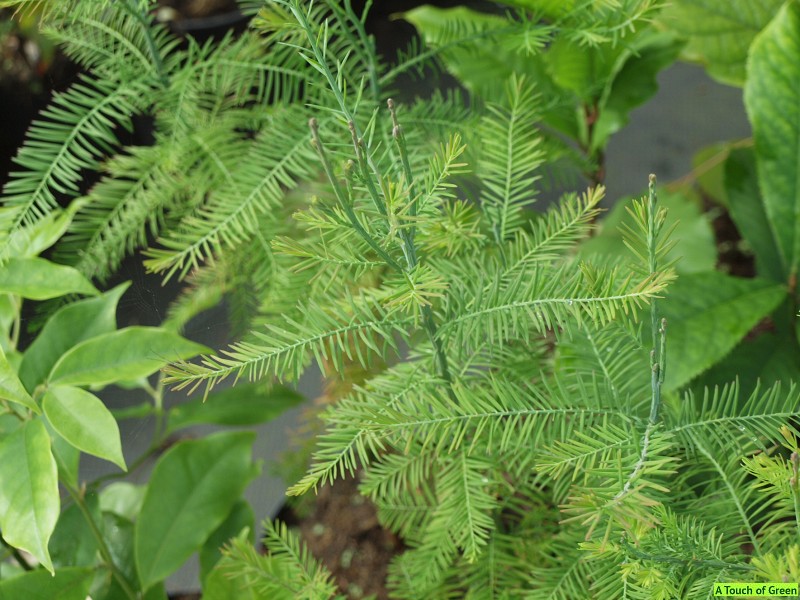 Побеги двух типов – не опадающие и опадающие. Листья не опадающих побегов (на осевых и плодоносящих ветвях) чешуйчатые, прижатые к стеблю и налегающие друг на друга. Листья опадающих побегов (на остальных ветвях) игольчатые, серповидные, расширенные в основании, 4-угольные в поперечном сечении, длиной в среднем 1 см, располагаются двумя рядами в одной плоскости (ссылка на источник фотографии)