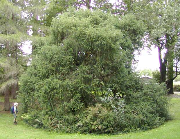 Cephalotaxus harringtonia в садовой культуре. Как видите, даже в этих условиях ширина кроны примерно равна высоте дерева. Это очень характерное свойство головчатотисовых в целом (ссылка на источник фотографии)
