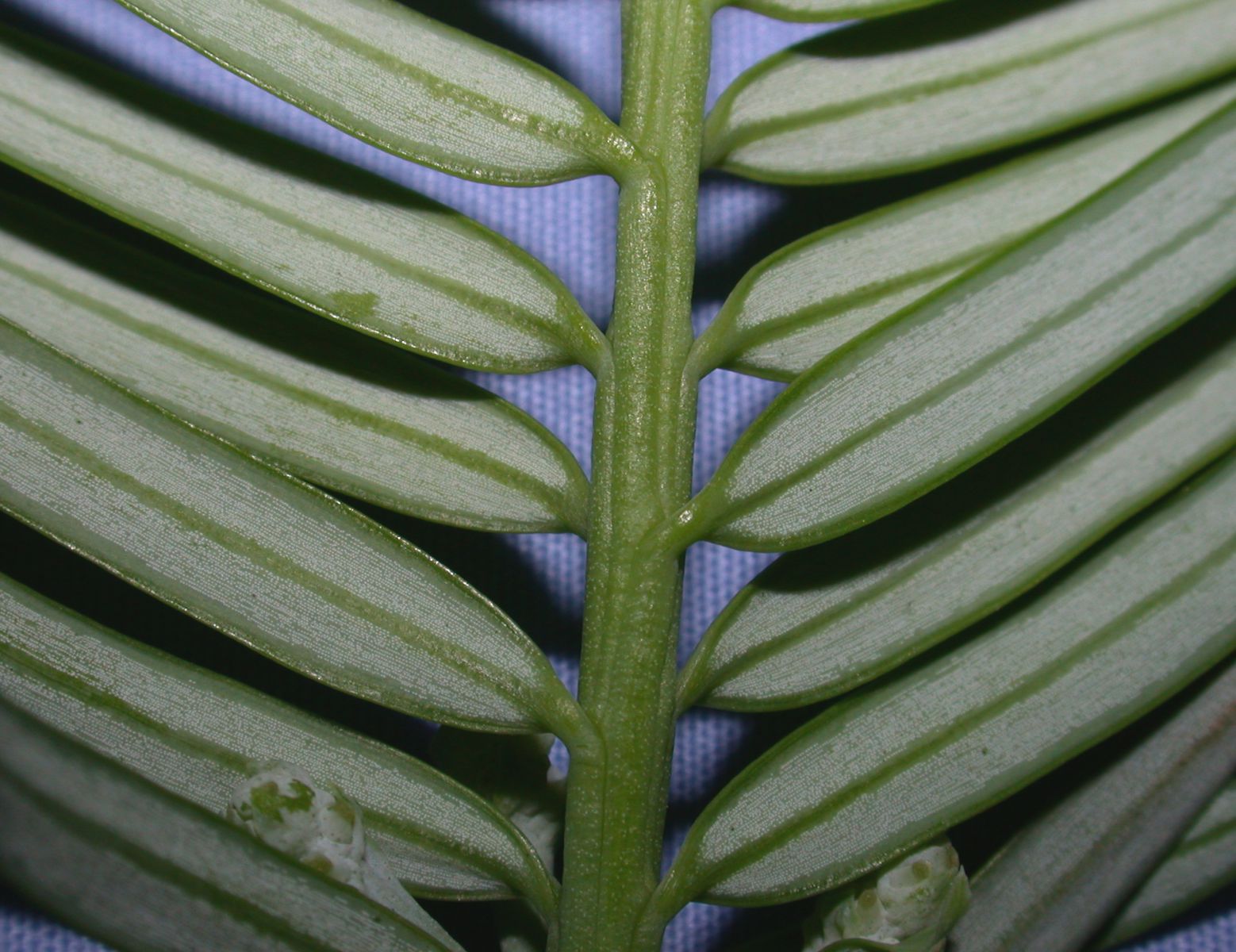 Cephalotaxus fortunei из Южного Китая. Так выглядят его листья с нижней стороны. Как и у других головчато тисовых, белые устьичные полосы у этого вида очень широкие. Обратите внимание также на листорасположение. Исходно оно было спиральным, а стало – идеально 2-рядным. Это общее свойство многих теневыносливых хвойных: адаптация к максимальному использованию дефицитного света (ссылка на источник фотографии)