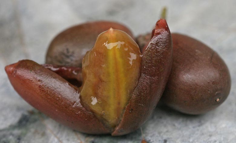 Семяпочки при основании окружены эпиматием в виде воротничка, который по мере созревания семени разрастается и превращается в наружный мясистый покров семени со смоляными полостями (ариллус). Эпиматий срастается с интегументом, последний становится каменистым, зрелое семя при этом приобретает сходство с плодом-костянкой покрытосеменных. В шишке обычно развивается только по одному костянковидному семени, редко по 2-3. Зрелое семя обычно эллипсоидальное, крупное, 2-3 см длины, красноватое или оливково-коричневое. Зародыш с двумя довольно широкими семядолями, которые при прорастании семени сбрасывают семенную кожуру и фотосинтезируют (надземное прорастание).