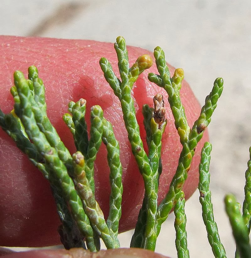 Callitris muelleri: веточки с микростробилами. Как видите, листья практически рудиментарные, едва выраженные и тесно прижатые к оси побега. Микростробилы небольшие, 3-6 мм длиной, и находятся на кончиках мелких веточек: терминальный + несколько латеральных (ссылка на источник фотографии)