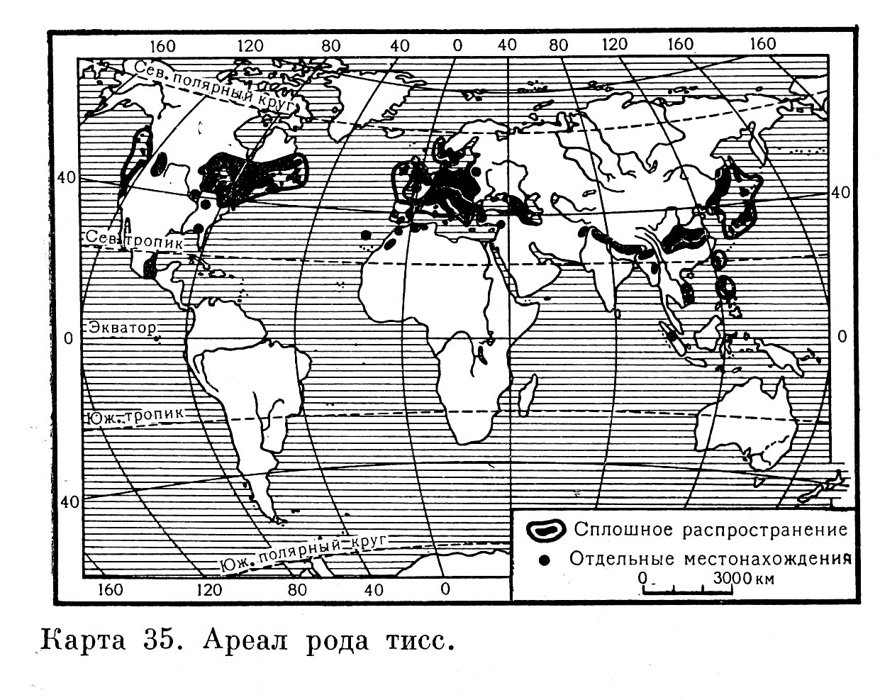 Ареал тиса. Как видите, он очень сильно фрагментирован. Это связано с его специфическими потребностями к климатическим условиям. Пригодные для него условия есть только на западе и на востоке материков, а также в некоторых горных системах (ссылка на источник рисунка)