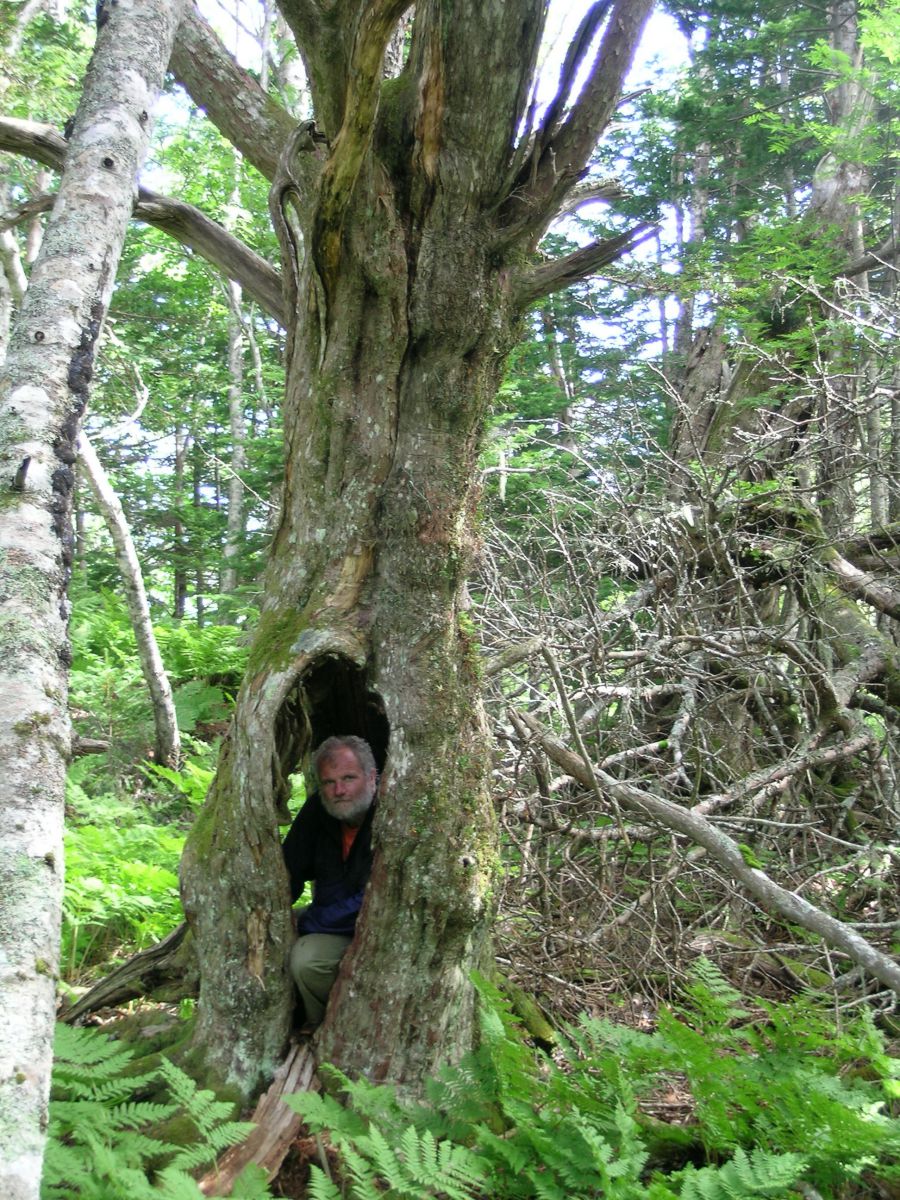 Старое дерево Taxus cuspidata на о. Кунашир. Практически все "долгожители" – полые внутри. При диаметре ствола 1 м и более слой живой древесины нередко составляет всего несколько сантиметров, а весь остальной ствол – это огромное дупло. Как видите, автор настоящей статьи – человек с размером выше среднего – отлично там помещается. Фото М. Ямбурова.