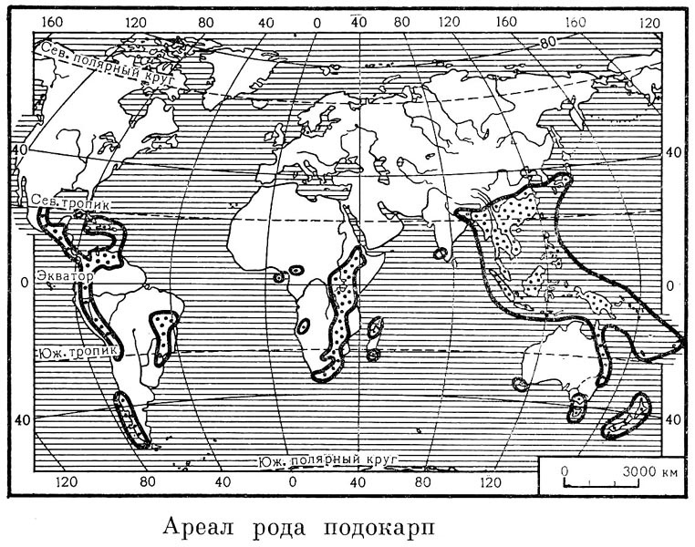 Современный ареал рода Podocarpus: обширный, но отнюдь не сплошной (до 15 фрагментов разного размера). Первое – признак процветания рода, второе – признак его древности (ссылка на источник фотографии)