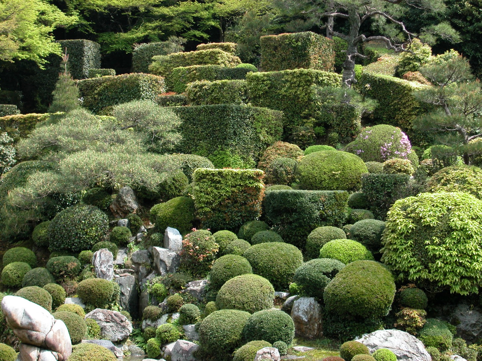 Тот ряд, о котором мы писали чуть выше (бонсай → ниваки → карикоми) есть также и в отношении близости «продукта» к природе. Бонсай – это точнейшая стилизация природы: чем точней, тем лучше. Ниваки допускает значительно больше разного рода вольностей. Карикоми в этом отношении меня просто поразил. Казалось бы, смысл карикоми – в плавных линиях обрезки (dan-zukuri или, по-английски – cloud pruning). Действительно, в большинстве случаев так оно и есть. Но наряду с этим в Японии применяется также и техника hako-zukuri (box pruning) – обрезка прямоугольной формы. Причем, такое насилие над природой, такой махровый кубизм, который даже в извращенной Европе встречается не часто, используется она не где-то на современных арт-объектах, а старых дзен-садах!
